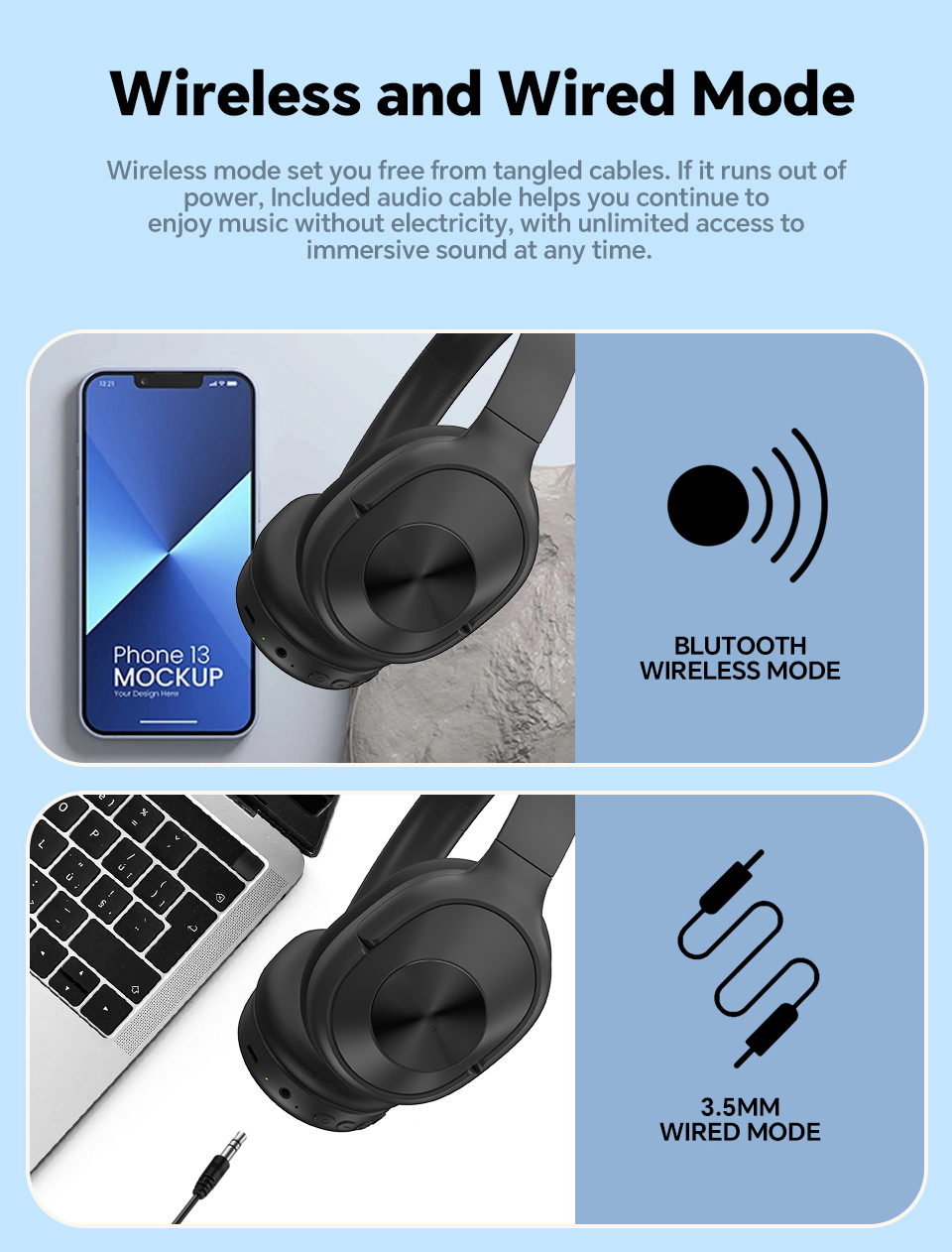 Ulisten B7 Foldable Extra Bass Headphone Hifi True Stereo Earphone Wireless Headphones Over-ear with Microphone