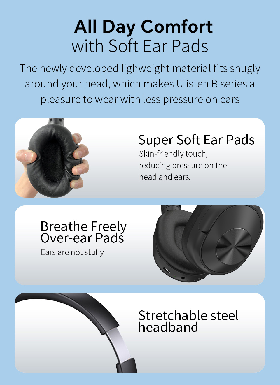 Ulisten B7 Foldable Extra Bass Headphone Hifi True Stereo Earphone Wireless Headphones Over-ear with Microphone
